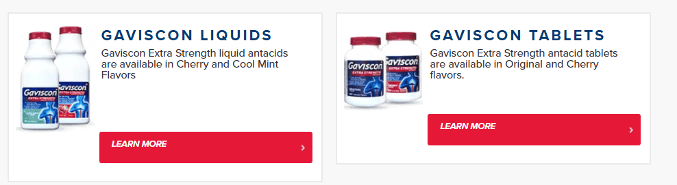 Gavison has two product lines as well: A liquid that you drink a spoonful of as needed and chewable antacids.