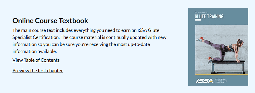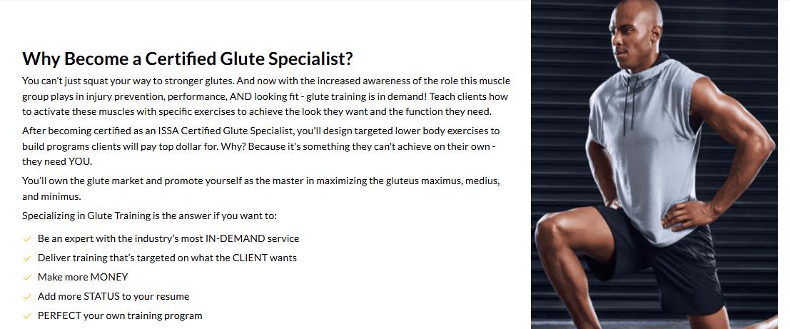 The ISSA website has a lot of really gimmicky words, in bold and CAPS, that focus on how training the glutes is an in-demand career right now, that adds status to your resume and helps you make more money, and helps you ensure that your clients get post-worthy results.