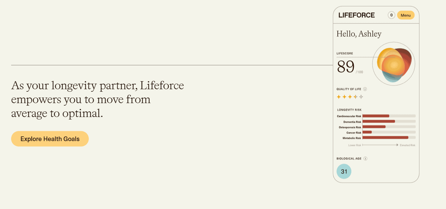 The core of the service is Lifeforce Diagnostic, a blood draw that measures 50+ biomarkers across hormones, metabolic health, organ function, and nutrients: