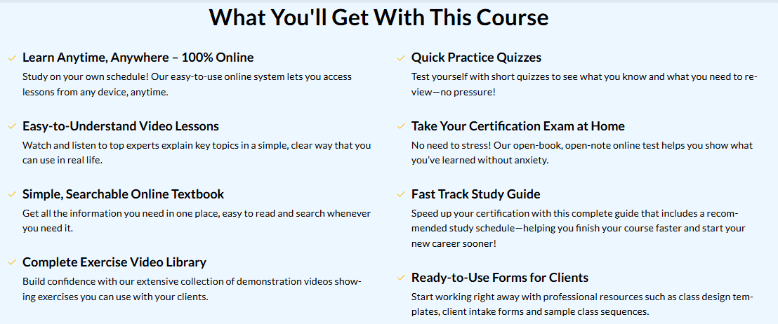 This is a highly rewarding course to take, in my opinion, with actionable information that includes the same type of career support and customized templates to help you build classes. If you are looking to add something like yoga classes to your existing practice at a gym, this is a good course. You can easily complete it within a few months at an affordable rate and start increasing the courses you can teach as a trainer.