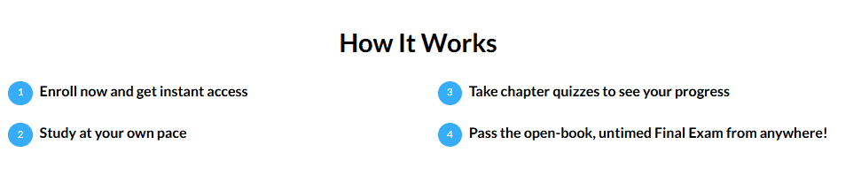 - An untimed and open-book final exam; if you fail the first time, you can retake for free