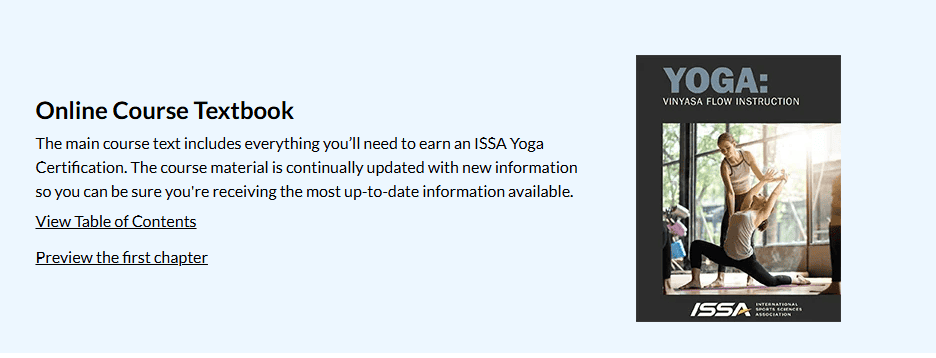 With the Yoga course through ISSA you can follow along in the textbook, but the chapter modules are broken up such that you might read a page or two, then watch a 20 minute video, then look through a few poses with image-based instructions, and then round off your module with a full, hour-long yoga session.