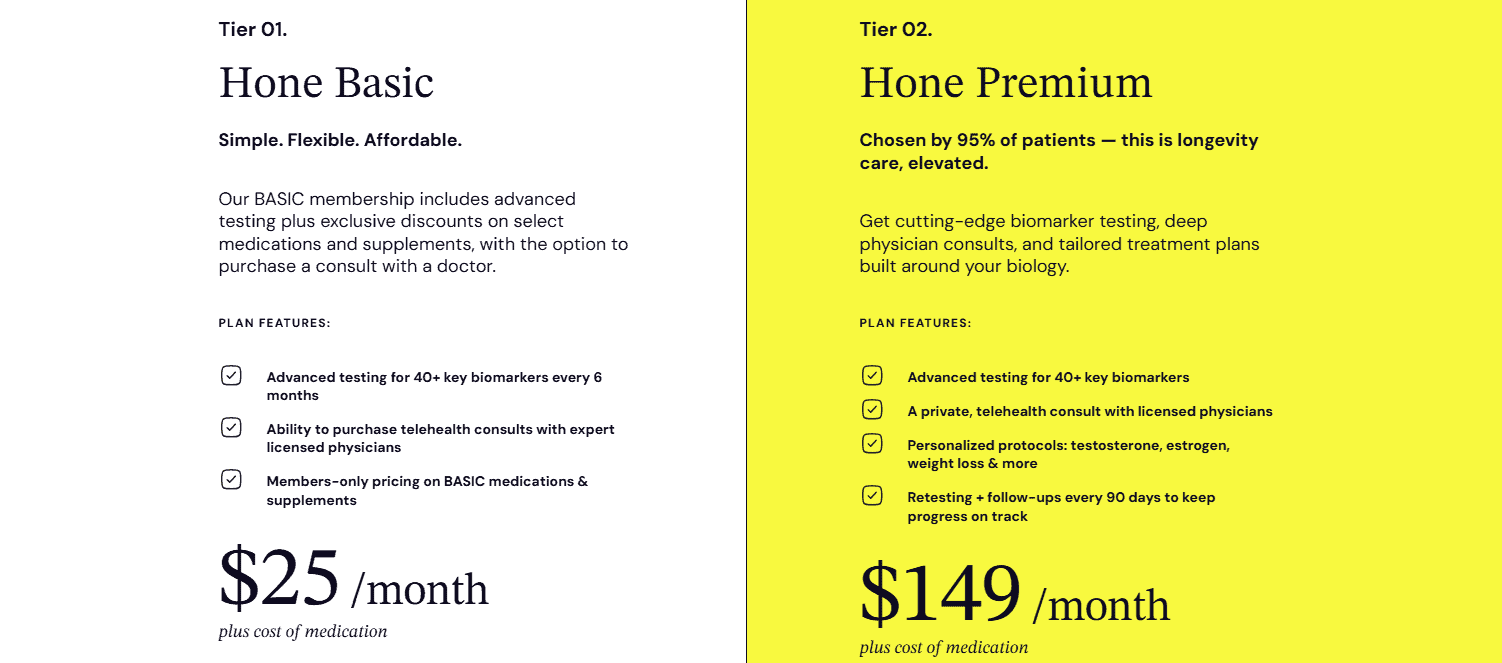 | Pricing | Membership: $349 (sign up for $199, then pay $149 per month- can cancel anytime) Annual Core Membership: $699 ($599 with initial purchase discount)Annual Classic Membership: $ 1, 548.00 ($1,448 with initial purchase discount)Baseline Diagnostic Panel: $549 | Hone Basic: $25 per month, plus cost of medication (includes Hone Premium: $149 per month, plus cost of medication Optimal Health Biomarker Starter test: $165 one-time fee ($65 with sign-up discount applied) |
