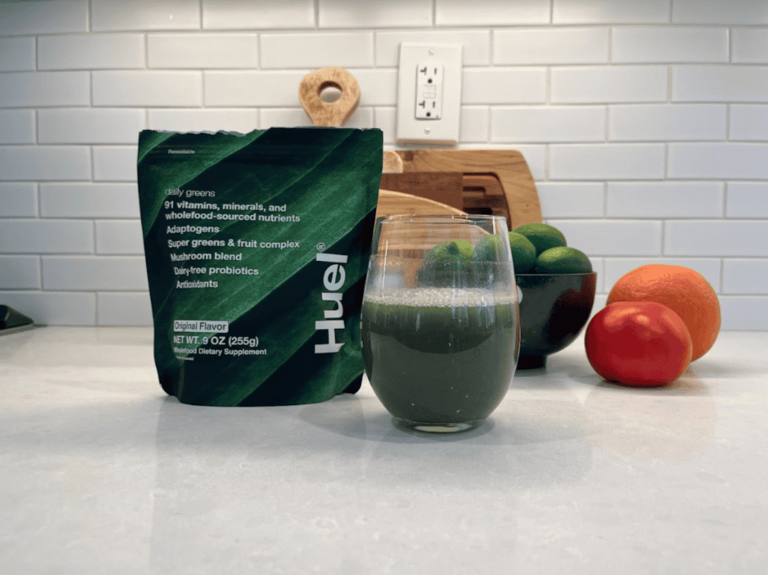 Huel Daily Greens is a superblend made with 91 different ingredients. It has an antioxidant blend, plant-based protein and super food blend, adaptogen and supermushroom complex, botanical blend, and probiotics blend.